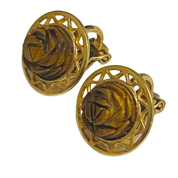 Sarah Coventry Clip on Earrings Round Carved Flower Center Gold Color Metal. Previously worn condi... Show more
