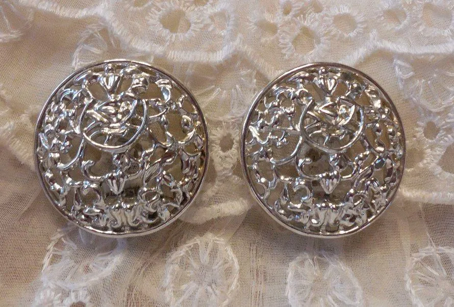 Marvelous Clip On Earrings By Sarah Coventry "Frozen Lace" From the 1950's Silver Tone Open Metal Work Rounds Measures 1 1/4" Across A Beautiful Filigree Design Perfect with Any Outfit In Excellent Vintage Condition