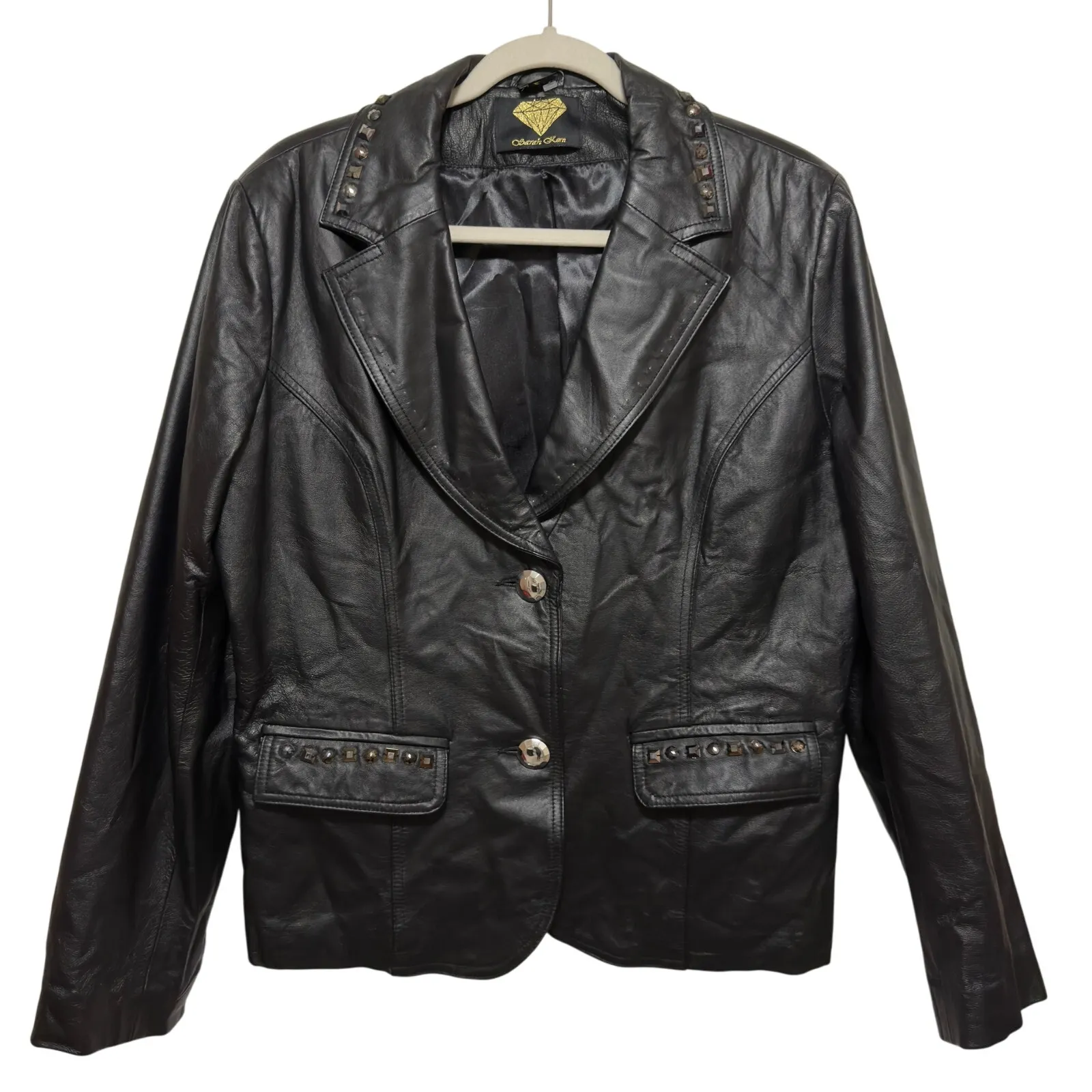 This striking Sarah Kern black leather blazer is the ultimate statement piece. Edgy silver stud embellishments on the collar and pocket flaps give it that perfect rocker edge. High-quality German designer piece that works as a blazer OR moto jacket. Genuine leather. Two-button closure. Those studs make it. SIZE: European 42/44 (US L/XL) Pit to Pit - 20.5" Length - 27" Perfect for: rocker aesthetic, biker chic, edgy style, moto fashion, rock and roll looks, punk vibes, statement outerwear.