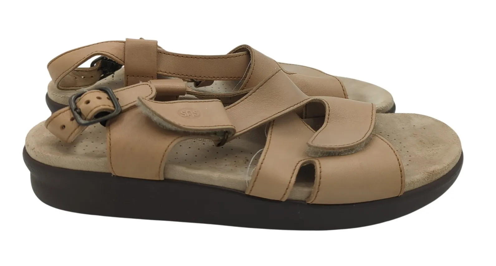 Style: Strappy Department: Women Upper Material: Leather UK Shoe Size: 10.5 AU Shoe Size: 12 Heel Style: Flat EU Shoe Size: 42 Features: Adjustable Strap, Arch Support, Buckle, Comfort, Straps Closure: Buckle Pattern: Solid Accents: Buckle, Logo Heel Height: Flat (Under 1 in) Type: Sandal Keywords: SAS shoes, comfort sandals, orthotic sandals, adjustable sandals, walking sandals, travel sandals, everyday sandals, supportive footwear, made in USA, tan sandals, outdoor sandals, summer shoes Please see photos for signs of wear, if any.