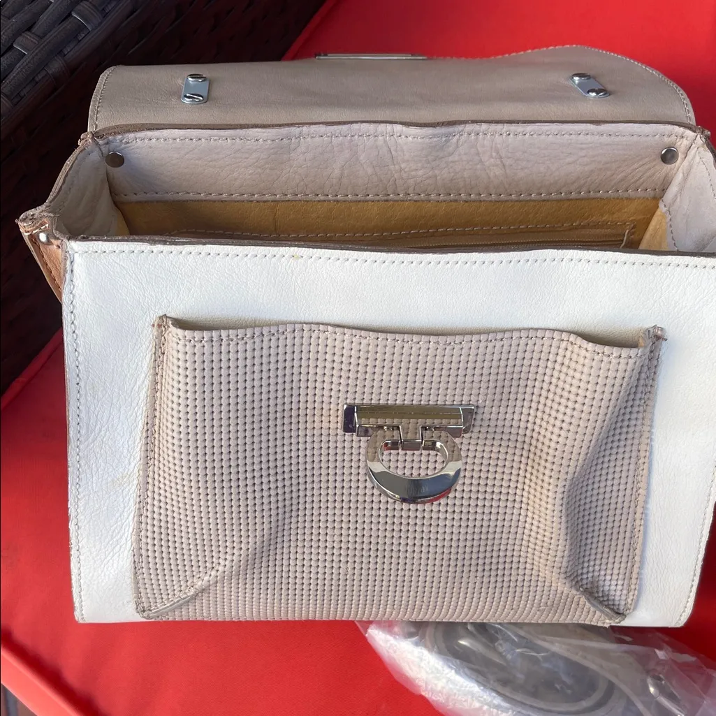 This elegant cream and tan handbag is perfect for any occasion. Its stylish design and versatile col... Show more