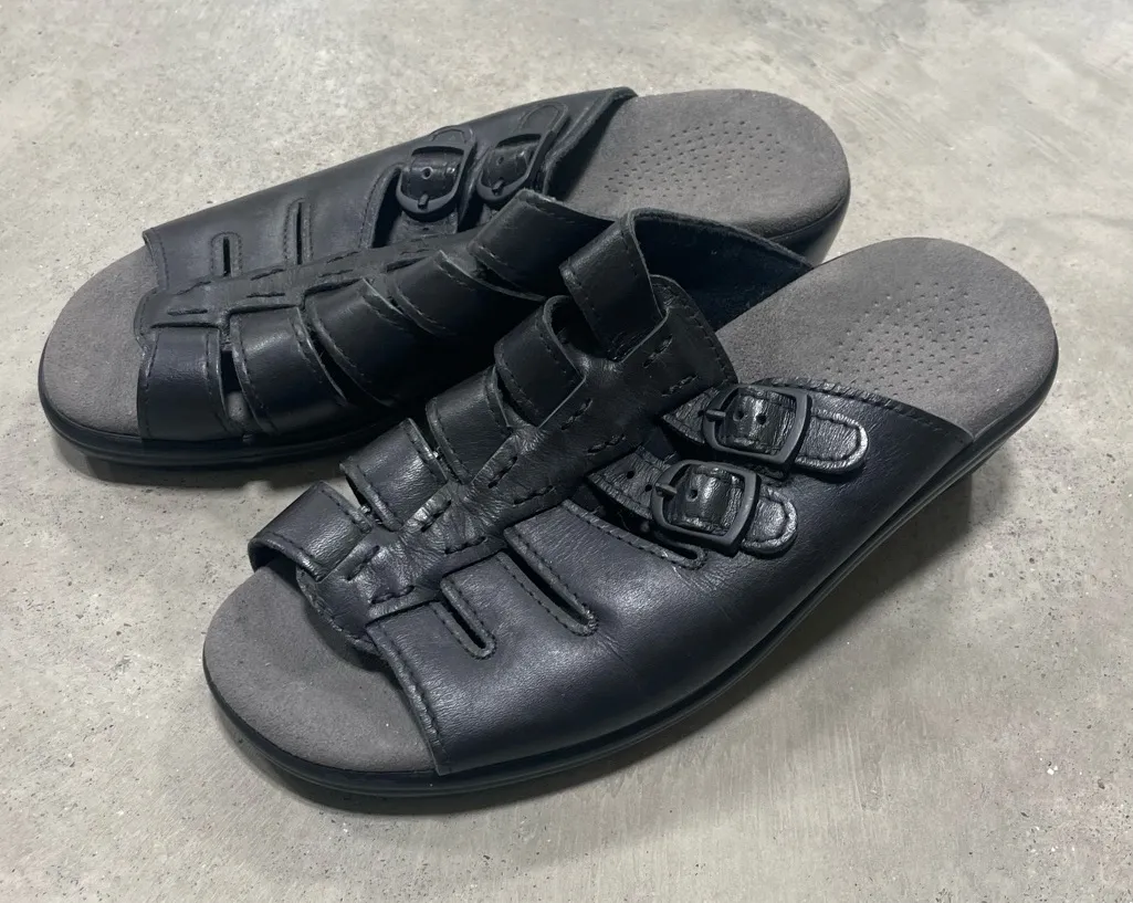 If you’re looking for comfort and quality you will love these slide leather upper sandals. SAS tripad comfort insole, two adjustable buckle straps Padded lining for extra protection and 2” wedge heel. Good Condition!