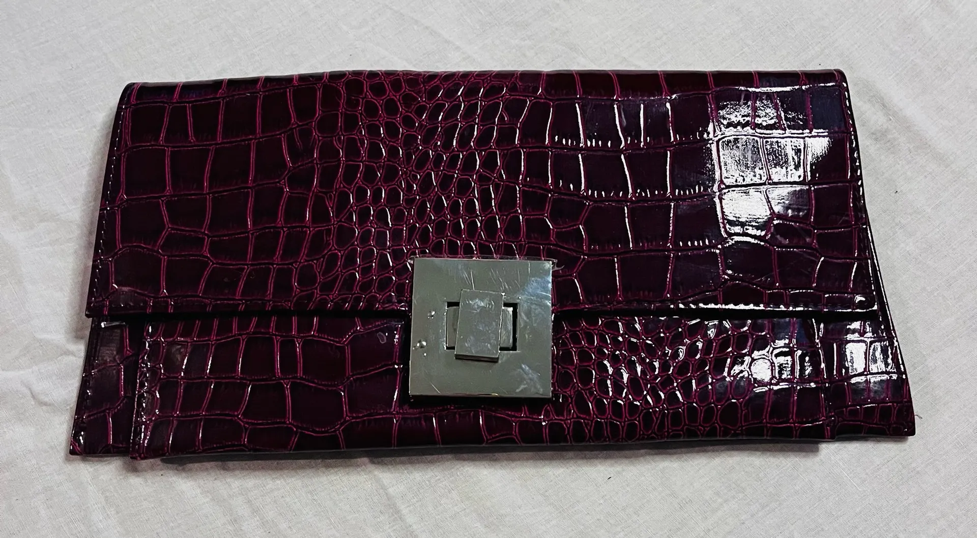 Sophisticated maroon evening clutch featuring a glossy patent finish and embossed crocodile texture. This elegant handbag includes a prominent silver-tone square turn-lock closure that adds a modern touch to a classic silhouette. Inside offers enough space for your phone, keys, and cards, making it perfect for weddings, date nights, or formal events. The rich deep purple/burgundy hue pairs beautifully with neutral or black outfits. Good pre-owned condition. The exterior is clean with a high shine. Some light surface scratches are visible on the silver hardware from normal use. No tears or interior stains. Grey marker stain on outside needs cleaning.