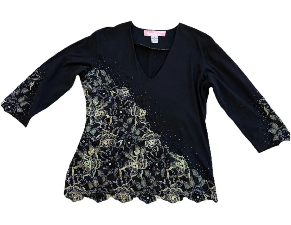 This Sassy Thai Women's Black Cotton Knit Top is a stylish and versatile piece perfect for various occasions, from parties to casual wear. The top features hand beading and floral lace detailing at the V-neckline, adding a touch of elegance and sophistication to the classic fitted 3/4 sleeves. Made of cotton knit fabric, this vintage-inspired top is ideal for all seasons and showcases a solid black color with a trendy handcrafted design. Perfect for those who appreciate 90s, gothic, and fairy themes, this top is a must-have addition to any wardrobe.