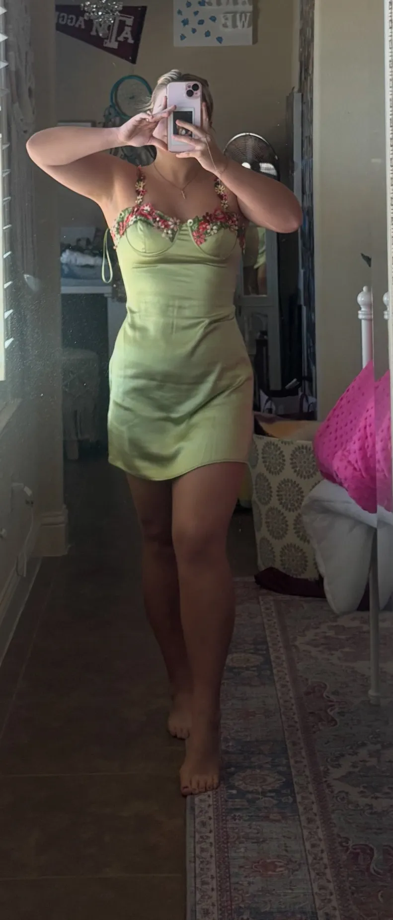 Satin light green dress with flowery straps and trim. Size small. Worn once. Great for sorority functions. - $18 - From Penny
