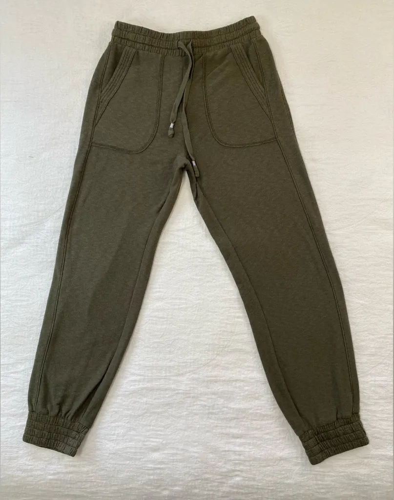 These Saturday Sunday by Anthropologie textured knit joggers in size Small are in excellent pre-owned condition and offer effortless comfort with a relaxed fit. Made from a soft knit blend with comfortable stretch, they feature an elasticized drawstring waist, roomy side pockets, and ribbed elastic hems at the ankles. Perfect for lounging, travel, or casual everyday wear, these joggers reflect Anthropologie’s laid-back aesthetic while remaining versatile and easy to style year-round.