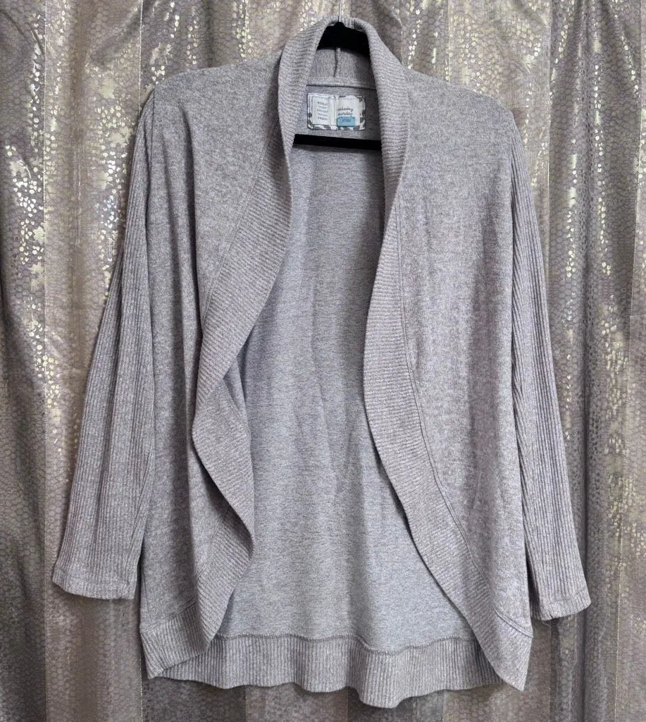 Good used condition, smoke and pet free home. No major flaws, some minor wear but nothing major at all. Its an Oatmeal Cream Beige color. Really soft, stretchy and cozy. Model photo is not the same color, similar fit- for style reference only. Size small Rounded hemline No pockets or front closure Ribbed sleeves and hemlines Viscose/Polyester/Elastic material blend Pit to pit laying flat across approx: 20” Top of shoulder to bottom hem length approx: 28.5”