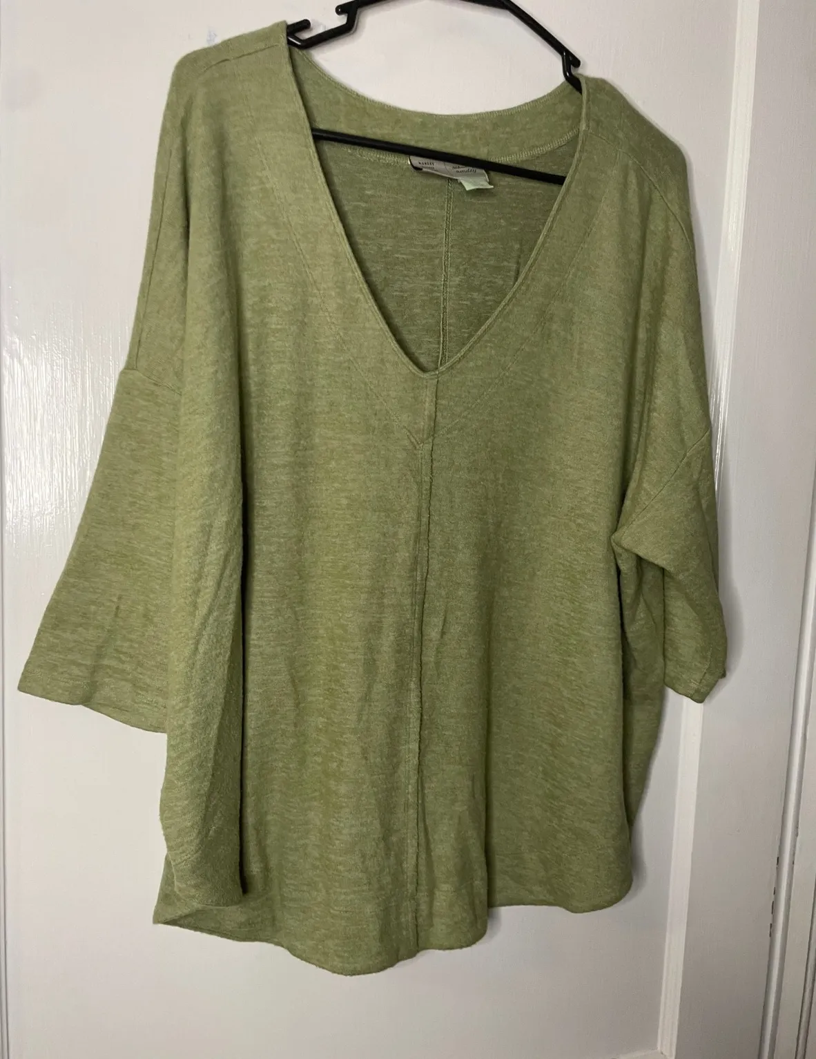Pit to pit 27" Length 24" Color: Green Type: Blouse Department: Women Style: Basic Material: Polyester Blend, Polyester, Spandex Neckline: V-Neck Sleeve Length: 3/4 Sleeve Sleeve Type: Casual Sleeve Accents: Seam Pattern: Solid Features: Lightweight, Comfortable, Relaxed Fit, Loose Fit, Easy Care Character: Bohemian, Casual Chic Fit: Relaxed Keywords: women's top, blouse, v neck, 3/4 sleeve, casual, green top, saturday sunday, loose fit, relaxed fit, comfortable, lightweight, everyday wear, boho, bohemian 127