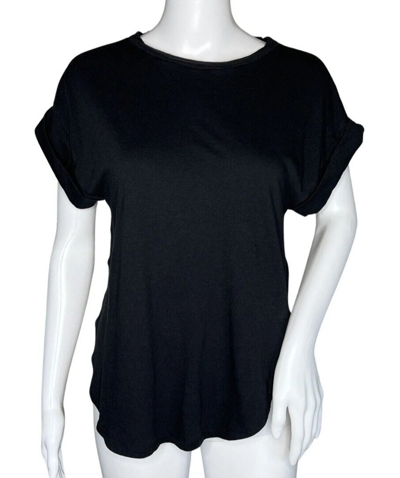 Satva Shirt Womens Small Black Open Back Athletic Top Workout Yoga Athleisure Women's Size Small Short Sleeve Crew Neck Round Hem Split Sides Cotton Modal Blend Stretch Measurements are Approximate: Length 20" to 25" Armpit to Armpit 17” Gently Used Condition. No Rips Tears or Stains (0754)