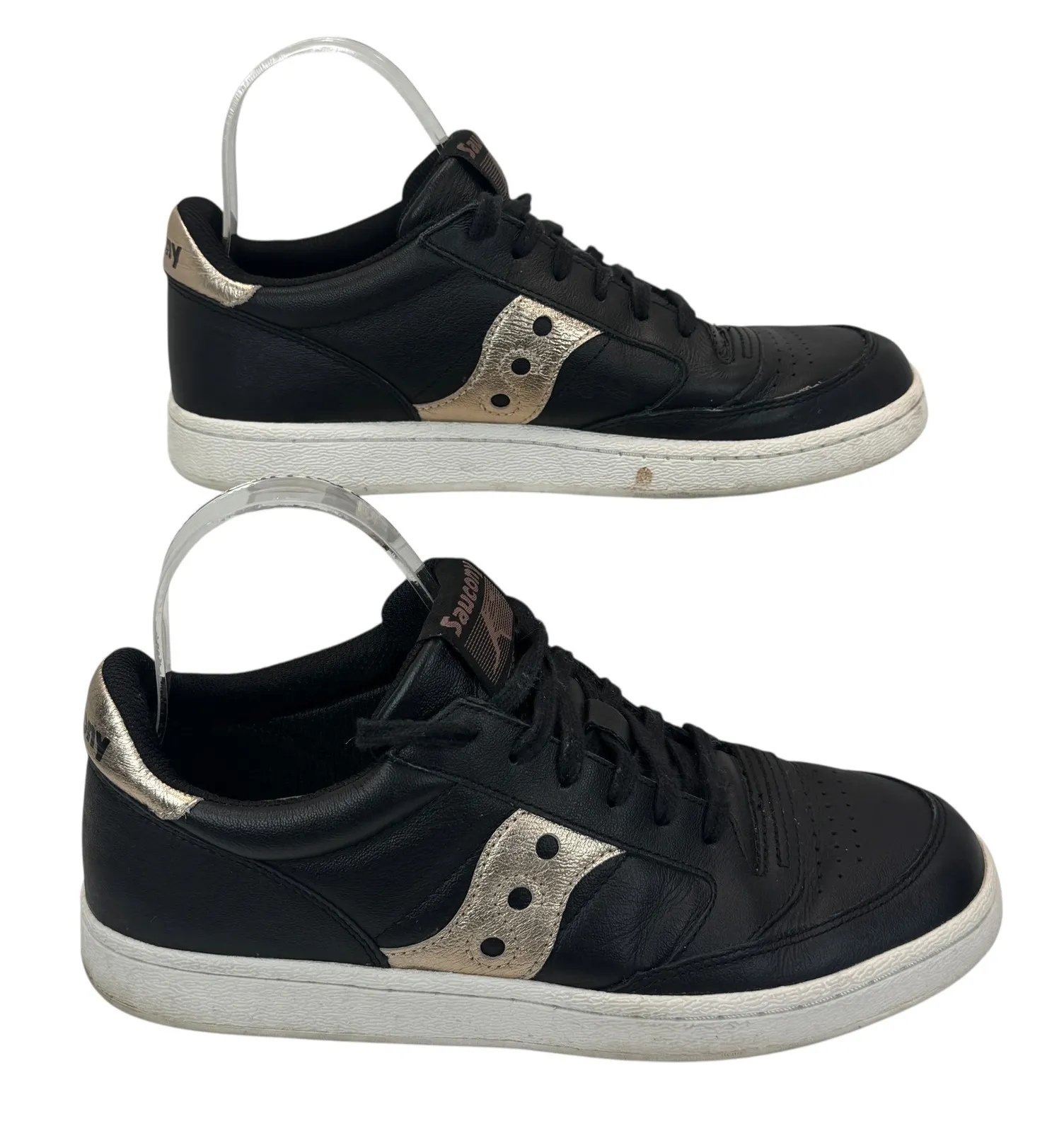 Women's Saucony Jazz Court in sz 9.5 — a sleek black leather low-profile sneaker with metallic gold... Show more