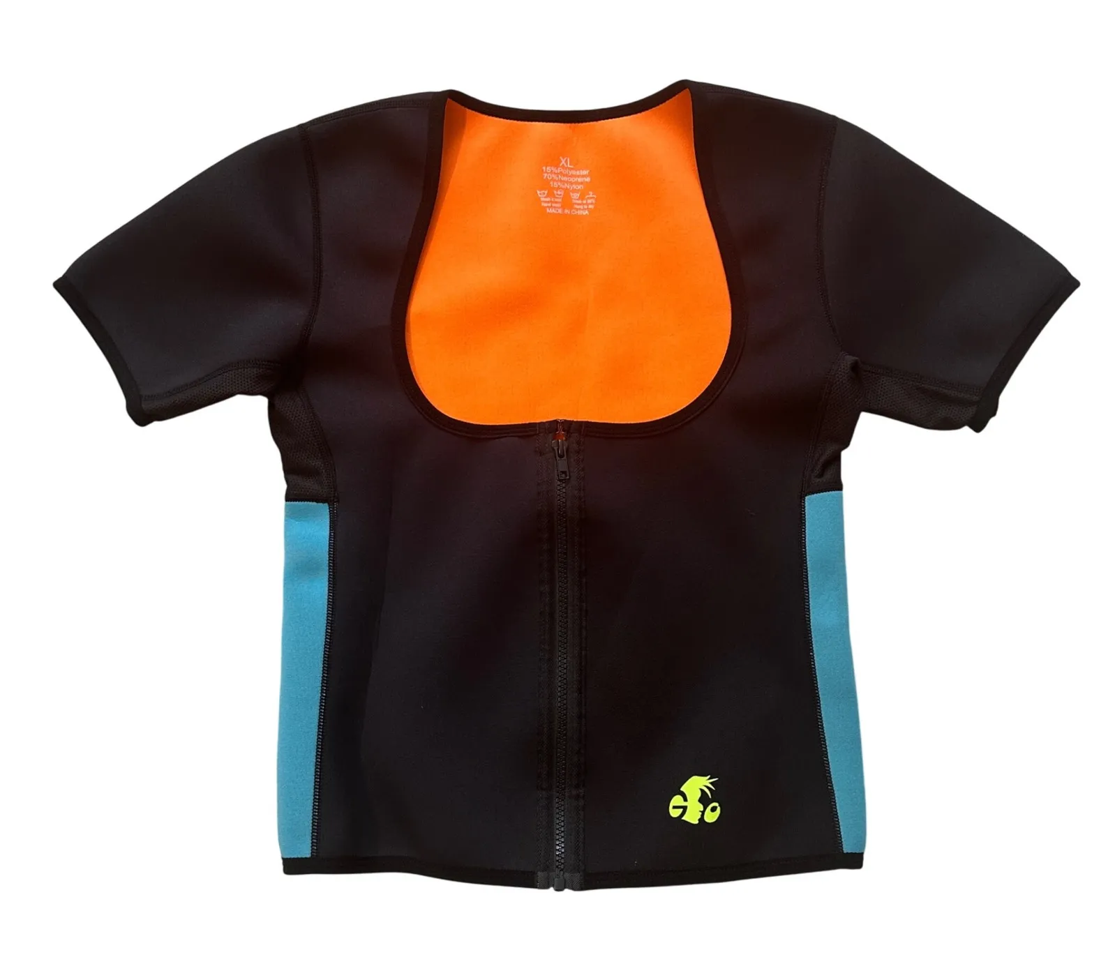 Unleash your inner potential with this innovative sauna vest, designed to amplify your workouts and sculpt your physique. The unique neoprene construction intensifies heat retention, promoting increased perspiration and calorie burn during exercise. Featuring a comfortable, form-fitting design with short sleeves and a full-zip front, this vest allows for a full range of motion while providing targeted compression to your core. The vibrant orange interior adds a pop of energy, while the sleek black exterior with turquoise accents offers a stylish look. Perfect for wearing during gym sessions, outdoor runs, or even while doing chores around the house. Gently used. Keywords: sauna vest, workout top, neoprene, slimming vest, body shaper, fitness apparel, exercise shirt, sweat vest, weight loss, gym wear, activewear, compression shirt, sauna suit, workout gear