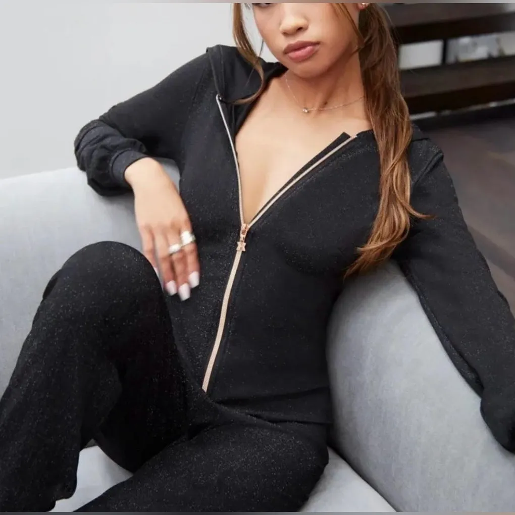 Must-have lounge glam This Savage X Fenty Sleep & Shine Hooded Onesie is equal parts cozy and sexy. Crafted in a soft, shimmery black lurex knit, it features a flattering relaxed fit with a hooded neckline and rose gold-tone zip front for that elevated, luxe feel. Perfect for lounging, travel days, or stylish sleepwear. Loungewear, Sleepwear, Onesie, Hooded, Zip Front, Shimmer, Cozy Chic, Lounge Glam, Travel Outfit, blackbirdbysmith