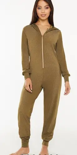 Savage X FENTY Sleep & Shine Hooded Onesie in Military Olive Green Size Small Excellent Used Condition Sleep in and stay up late in our Sleep & Shine Hooded Onesie. Featuring a flattering silhouette with a relaxed fit, hood, and zipper front. Soft, shimmery lurex knit Hooded onesie Long sleeve with cuffs Rose gold-tone zipper with X logo pull Relaxed fit 78% Nylon, 15% Spandex, 7% Metallic Hand wash cold, line dry Do not bleach, iron, or dry clean No trades, offers welcome!