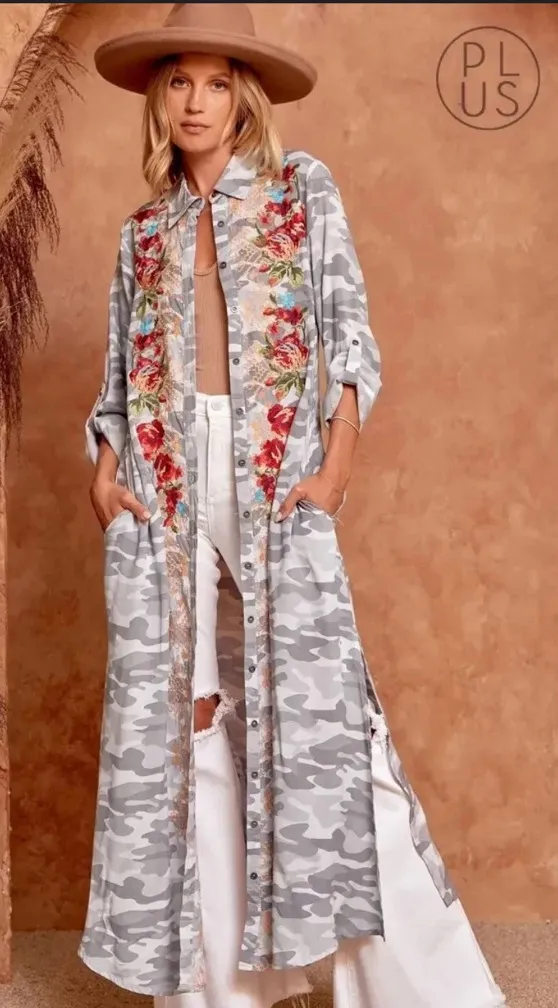 The Savanna Jane Maxi Dress is a stylish and versatile piece perfect for casual occasions in the winter, fall, and spring seasons. This gray camo dress features a unique floral embroidered design with a button front closure and long, roll tab sleeves. Made from soft rayon material, this dress has a collared neckline and a long dress length, offering a boho and western-inspired look. Ideal for women who love to stand out, this dress is a hand wash only garment that exudes a trendy yet comfortable vibe.