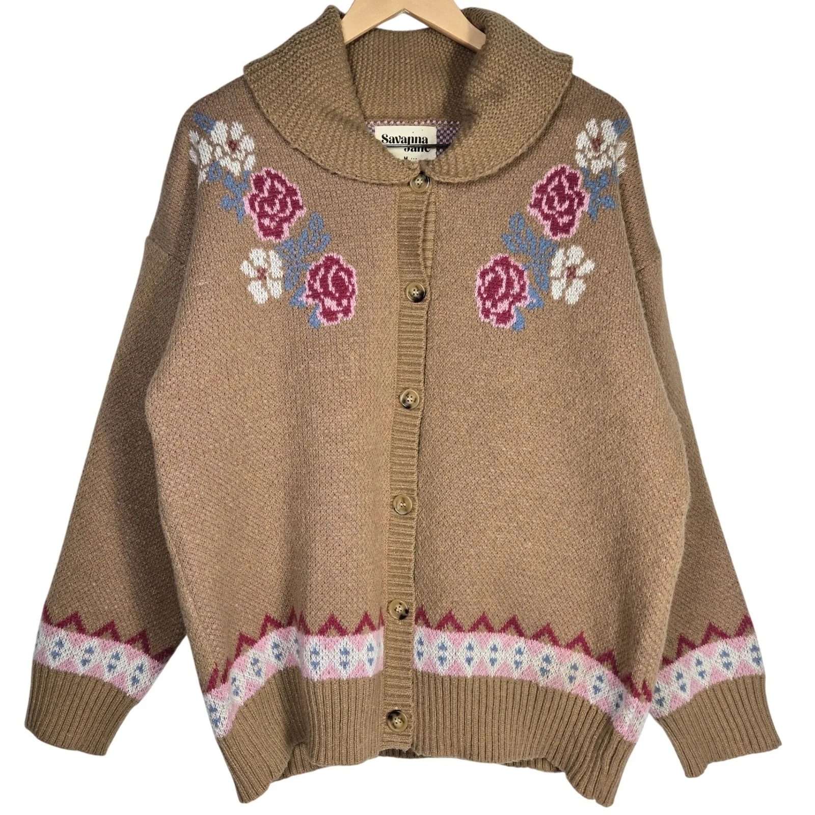 Savanna Jane One More Shot Longhorn Floral Knitted Cardigan Sweater Size M Size: M Style: T10679 Material: 100% Polyester Retail: $ Savanna Jane button up knitted cardigan with Floral and Longhorn details. Medium thickness, slightly relaxed fit. Shawl collar. Measurements are in the photos. • Pit to Pit: 23 in • Length: 27 in • Sleeve Length: 20 in In great pre-owned condition with no known flaws and minimal signs of wear. Keywords: Savanna Jane cardigan, Women's sweater, Bull skull sweater, Floral embroidery, Tan cardigan, Boho cardigan, Western style, Embroidered knitwear, Size M sweater, Cozy cardigan, Button front sweater, Unique knit, Designer cardigan, Fall fashion