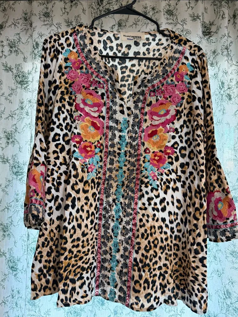 savannah jane embroidery 3/4 sleeve top shirt size small cheetah print - $36 - From Karla