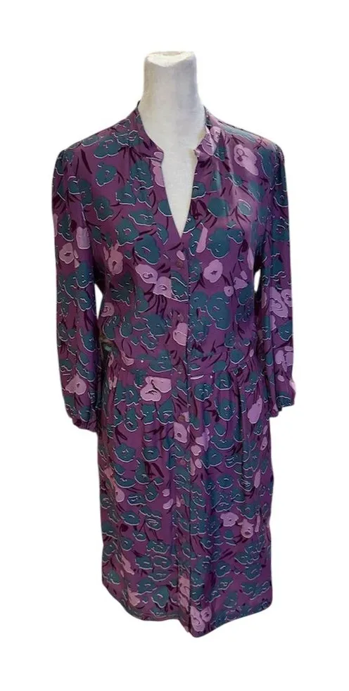 This vintage dress from Sax Fifth Avenue is a classic piece in a rich purple floral pattern. Made from silk, it features a midi length, long sleeves, and a V-neckline with a button-down front. Ideal for party or cocktail occasions, it embodies an elegant and sophisticated theme. Suitable for spring, it requires dry cleaning. The dress is pre-owned. Brand: Sax Fifth Avenue Size: XS Size type: Standard Style: Vintage, Classic Dress length: Midi Color: Purple Department: Women Sleeve length: Long Sleeve Pattern: Floral Occasion: Party/Cocktail Material: Silk Theme: Elegant, Sophisticated Neckline: V-Neck Vintage Season: Spring Closure: Button Features: Floral Print, Button-Down Front Garment care: Dry Clean Only Condition: Pre-owned Not nwt
