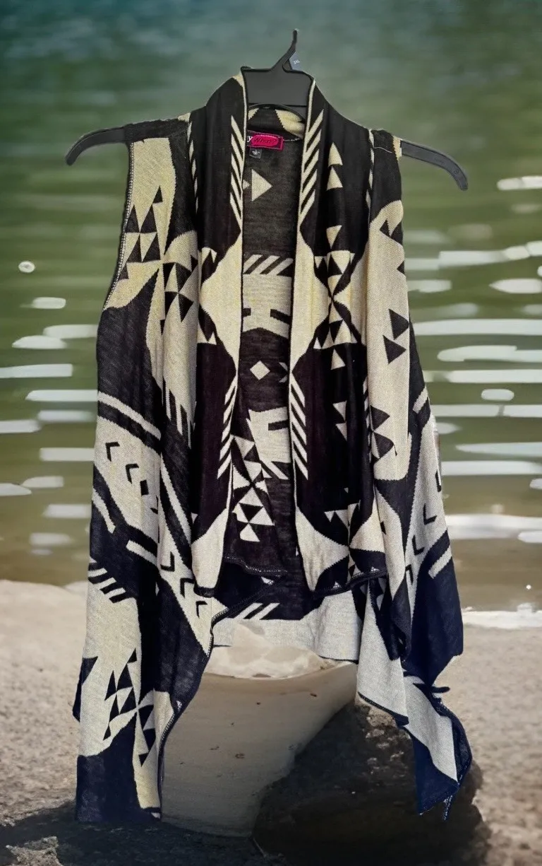 Embrace bohemian charm with this striking open-front vest, a versatile layering piece designed to elevate your everyday style. Its intricate geometric pattern, a captivating dance of black and beige, draws the eye and adds a touch of artistic flair to any outfit. The effortlessly draped silhouette creates a flattering, flowing line that moves beautifully with you, while the sleeveless design makes it perfect for transitional weather or adding a touch of personality to a simple tee. Imagine yourself strolling through a farmer's market, enjoying a casual brunch with friends, or adding a unique finishing touch to your evening wear. Measurements: • Length from shoulder to hem: 27 inches • Back width: 16 inches Outer Shell Material: 100% Acrylic Style: Basic Jacket Department: Women Theme: Boho, Geometric, Art Features: Open Front, Sleeveless, Drape Front Fabric Type: Knit Pattern: Geometric Season: Spring, Fall, Summer Occasion: Casual, Travel Keywords: Say What vest, geometric print vest, sleeveless cardigan, open front vest, bohemian vest, women's large vest, tribal print vest, ethnic print vest, lightweight vest, fashion vest, travel vest, casual layering, fall fashion, spring fashion