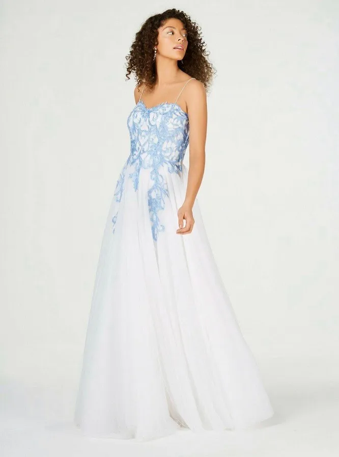 Pretty rhinestone-sprinkled tendrils tumble down the bodice of this ballgown that can be styled with or without the straps. Approx. 61" long from center back to hem. Length is based on size 7 and varies approx. 3/8" between sizes. Sweetheart neckline Corset-style lacing at back; hidden side zip closure Removable straps Rhinestone appliqués at bodice; tulle skirt Molded cups; crinoline at lining hem Shell, lining & trim: polyester