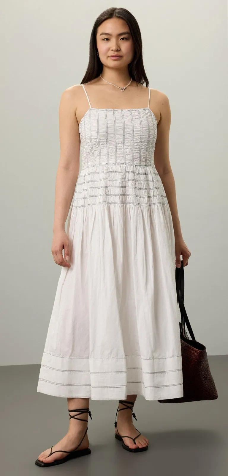 The Saylor Adalene dress is a midi dress crafted from twill. It features a smocked bodice, a drop wa... Show more