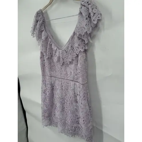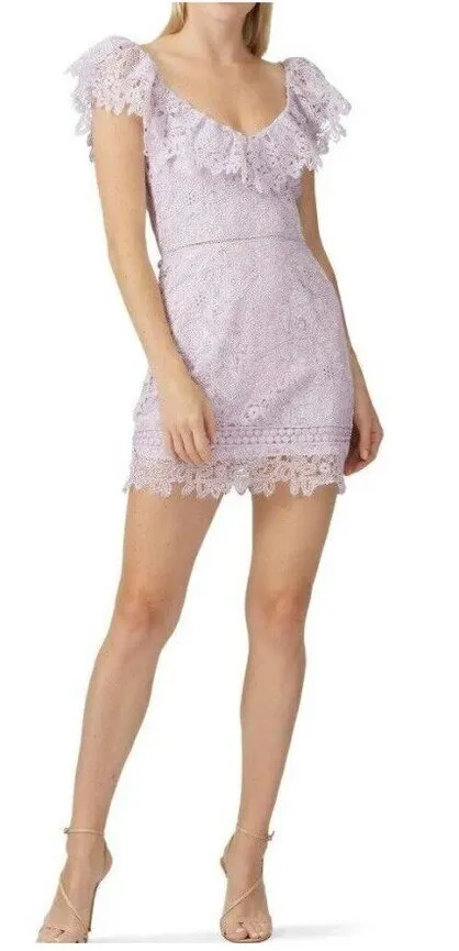 Lilac lace (100% Polyester). Sheath. Flutter sleeves. V-neckline. Hidden left side seam zipper closure. Hook and eye closure. Fully lined. 31.5" from shoulder to hemline. Imported. This soft and feminine ruffled mini dress by Saylor frames your best attributes in lilac floral lace with trim details Great pre owned condition. All measurements are approximate: 18 inches pit to pit. 30 inch waist: 32 inch hip. 31.5 inch length. BB11
