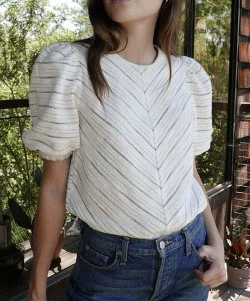 Excellent condition adorable knit pop-over top with smocked sleeve cuffs and side seam vents. Looks great with a french tuck. Sedona Stripe Knit. Button closure at back neck with keyhole opening. Approximately 21” long and 16” armpit to armpit.