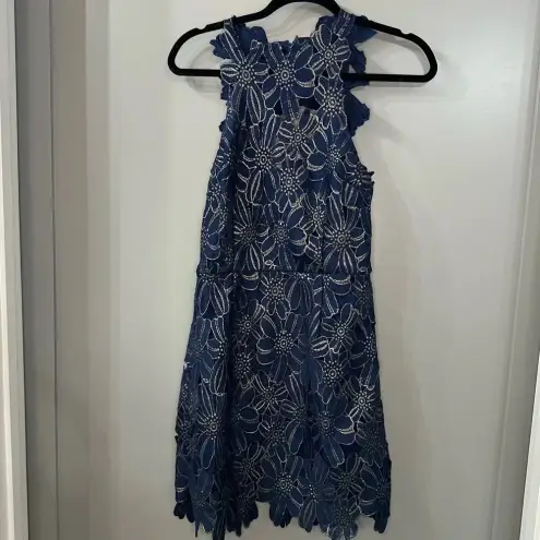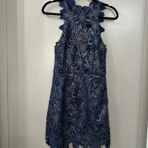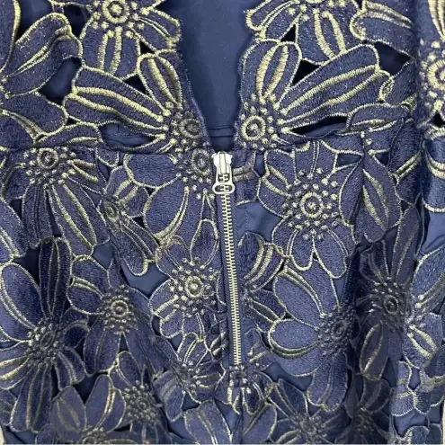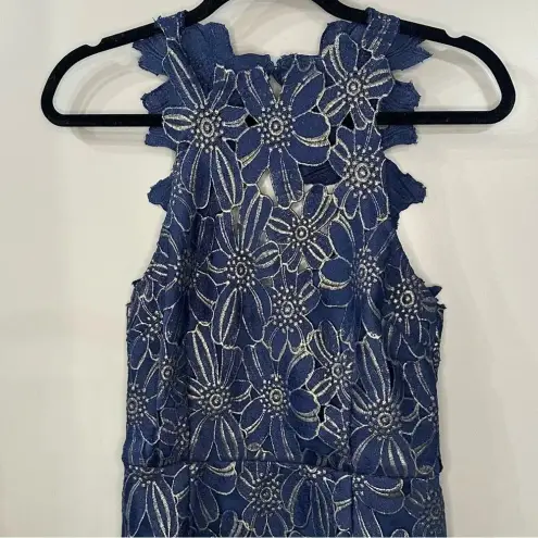 SAYLOR Sold at FREE PEOPLE and REVOLVE Floral Lace High Neck Bodycon Mini Dress Size M, Medium Navy blue & gold metallic Cut-out back with closure. Scalloped trim. Excellent preowned condition. See pics. Self & Lining: 100% poly. Dry clean only. Partially lined.