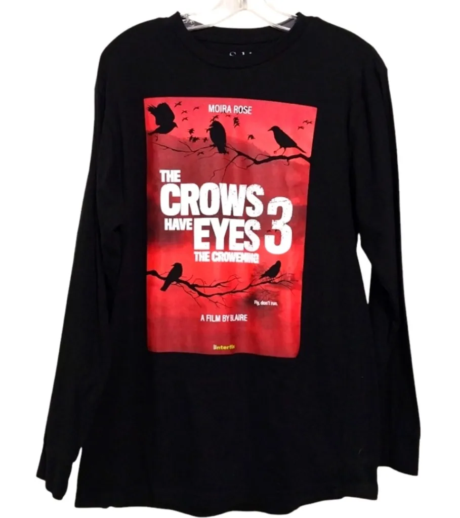 Stylish black long sleeve tee featuring a bold red graphic. Perfect for casual outings. 100% Cotton Approx measurements laying flat Pit to pit 20” Length 29" Excellent used Condition Freshly laundered Smoke free home Halloween costume Moira rose schitts creek the crows have eyes 3 caw caw Alexis rose David rose