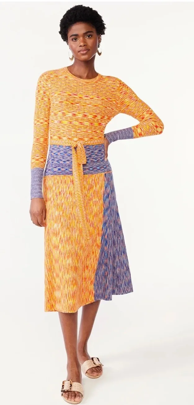 Excellent Pre Owned, Gently Used, Gently Worn Condition No flaws or damage Scoop brand knit midi dress with a vibrant orange blue and yellow striped pattern. This dress features a flattering ribbed texture, long sleeves, and a matching removable belt to cinch the waist. The colorblocked design with contrasting blue cuffs and skirt panel adds a unique flair. Perfect for a casual day out or a stylish brunch. Style: Sweater Dress, Wrap Dress Dress Length: Midi Department: Women Sleeve Length: Long Sleeve Pattern: Geometric Occasion: Casual Material: Viscose, Polyester, Nylon Fabric Type: Knit Theme: Colorful Neckline: Round Neck Season: Spring, Fall Sleeve Type: Long Sleeve Closure: Pullover Accents: Tie Features: Stretch Keywords: midi dress, knit dress, striped dress, belted dress, colorblock, long sleeve dress, fall fashion, winter fashion, casual dress, brunch outfit, day dress, workwear, preppy, dopamine dressing, colorful, 70s, Retro, Comfy, Stretchy From A Smoke Free Pet Friendly Home All Questions & Offers Are Welcome 📦Always Ships Same Or Next Business Day