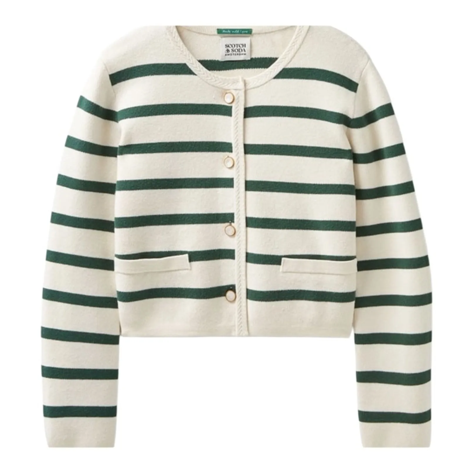 Product information - Neckline: Round Neck - Closure: button placket - Hand pocket(s) - Rib knit: cuffs, hem - Cut: straight - Pattern: Stripes - Color: Ivory With Green Stripes -50% Viskose - 28% Polyester - 22% Polyamid New With Tags