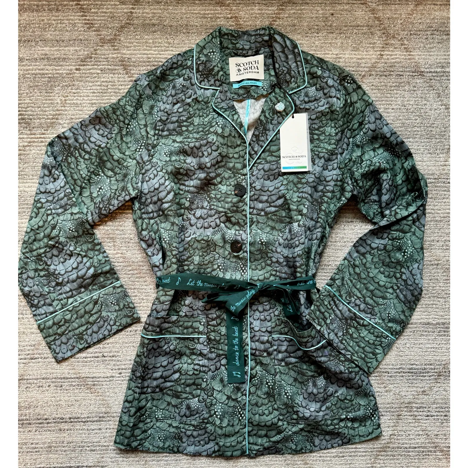 Unwind in style in Scotch & Soda's Pajama blazer in a luxe emerald green feather print. New with tags Womens size small printed ribbon belt included Retail price is $198 Loose-fit 100% Lyocell (TENCEL™) Color Feather Bottle Green Perfect for afterhours, sunday lounging or to throw on while on a beach vacation. You'll love the versatile and stylish Pajama blazer with feather print by Scotch & Soda