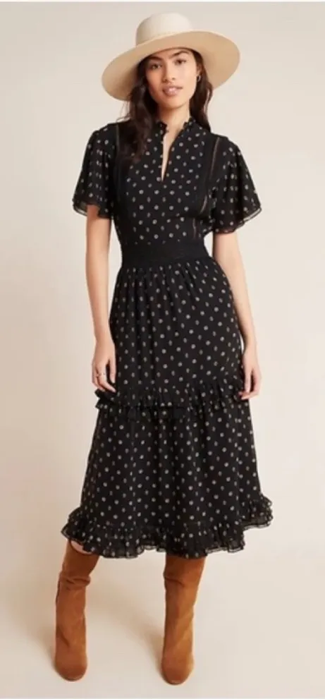 Scotch & Soda Maison Scotch Mille Nuits Tasha Ruffled Tiered Midi Dress Color Black Gold White Size Medium Fabric Polyester Made in India It is a black midi dress with a delicate gold and white pattern, a smocked waist, V-neckline, short ruffled sleeves, and a tiered ruffle hem. Hidden zipper on side under arm Crochet details are unlined underneath Dress is lined No holes or stains No snags 1212