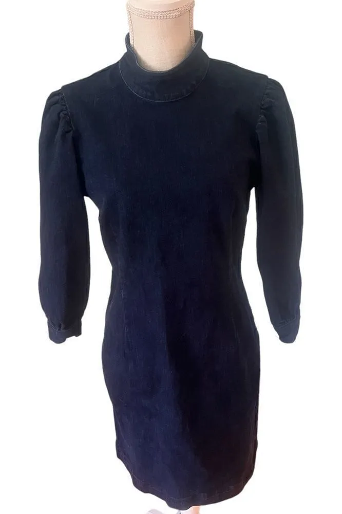 Scotch & Soda Dark denim mini dress with Mockneck, gold back zipper, and balloon sleeves. Gold buttons on cuffs. Size medium 98% cotton 2% elastane Great preowned condition! Bust 17.5” 33.25” length 19.25” sleeve length 16” waist 1579-32