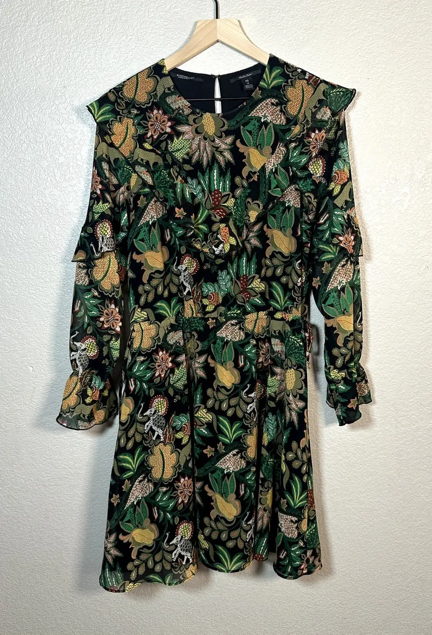 Excellent Pre Owned Condition Embrace your inner boho goddess with this stunning Maison Scotch dress in a jungle-inspired print. The long bell sleeves and round neckline give it a classic look, while the ruffle accents add a touch of whimsy. The knee-length shift dress features a hook and eye closure and drawstring waist, making it easily adjustable for any occasion. Perfect for travel, weddings, holy communions, parties, or even as workwear, this dress is versatile enough to be worn in any season. Made of polyester chiffon, it is both lightweight and lined, with elasticated cuffs and adjustable side ties for added comfort. Get ready to channel your inner hippie with this bohemian-inspired piece. Approx Measurements Laying Flat Pit to Pit 19.5" Waist 14.5" Length 38"