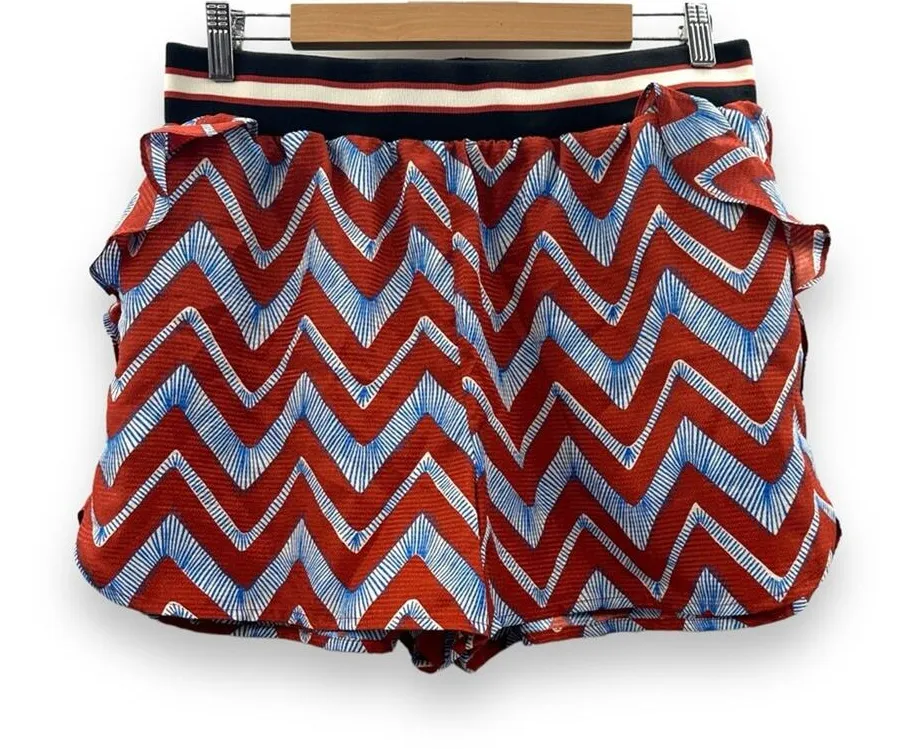 Scotch & Soda Maison Scotch Poolside Blue & Red Chevron Stripe Ruffle Shorts Crafted from lightweight fabric, these shorts offer both comfort and breathability, making them perfect for sunny days by the pool or casual outings. The eye-catching blue and red chevron stripe pattern adds a bold and trendy touch, ensuring you stand out with every step. Designed with ruffled detail at the pockets, these shorts bring a fun and feminine flair to your look. The elastic waistband provides a comfortable fit and allows for easy wear, while the relaxed silhouette offers freedom of movement. Whether you're lounging beachside or exploring the city, these shorts offer versatility and style that effortlessly transitions from day to night. Pair the Scotch & Soda Poolside Blue & Red Chevron Stripe Ruffle Shorts with a simple tank top and sandals for a laid-back, summer-ready ensemble. Add a floppy hat and oversized sunglasses for a chic beach look, or dress them up with a tucked-in blouse and espadrille wedges for a casual outing. The cheerful colors and playful design make these shorts a must-have for embracing the spirit of summer in style. High rise Short length (approx. 3" inseam) Red-orange, blue, and white chevron pattern Pull-on styling Red, black, and white striped waistband Ruffled side pockets 100% polyester Size: L Measurements are provided in pictures Condition: New with tags (NWT)