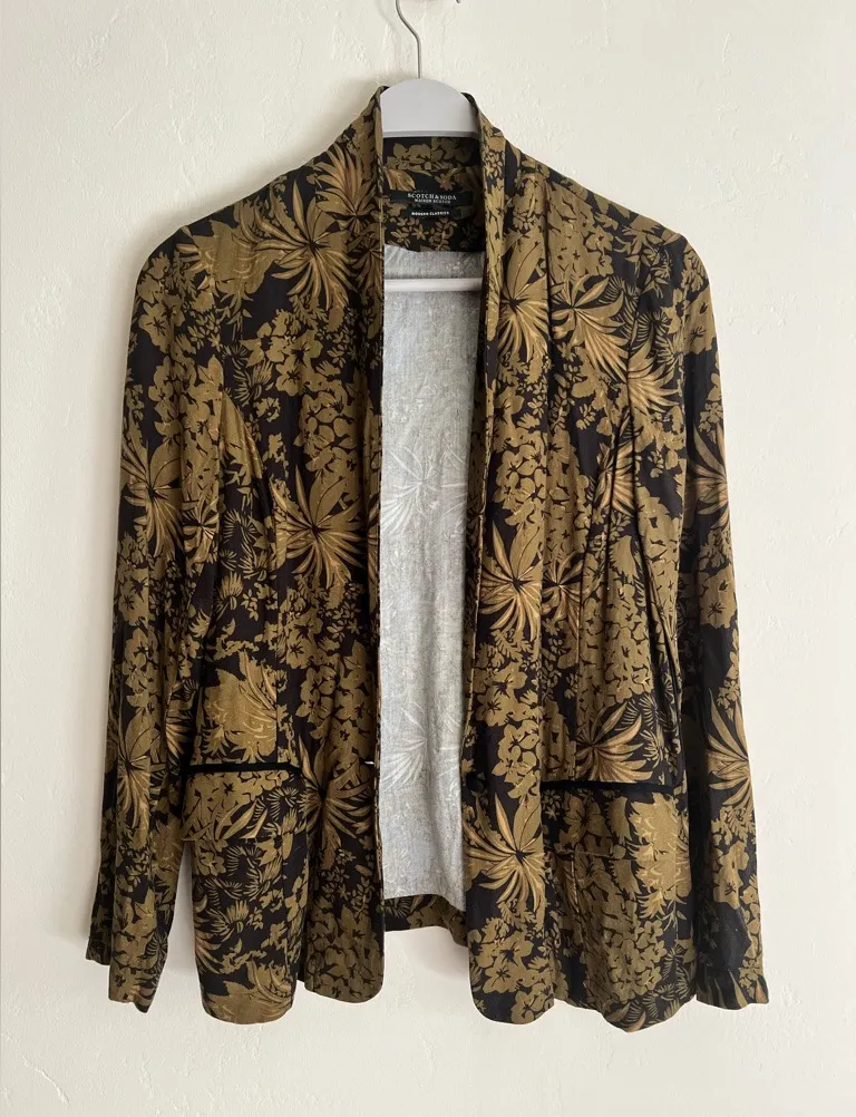 Scotch & Soda Maison Scotch Modern Classic Lightweight Women’s Blazer Jacket Details: • Size: Small • Color: Black, Dark Green Golden Color; has Black color panels on the side to give it that polished look • Print: Floral Tropical • 100% Viscose (for ultra comfort) • Super Lightweight • Two Front working Pockets Perfect for the office or date night! So versatile and will become easily a closet staple. *Please note there a little thread pull on the left side front of the jacket not super noticeable and doesn’t effect the quality of the piece. See photo and price will reflect minor flaw.