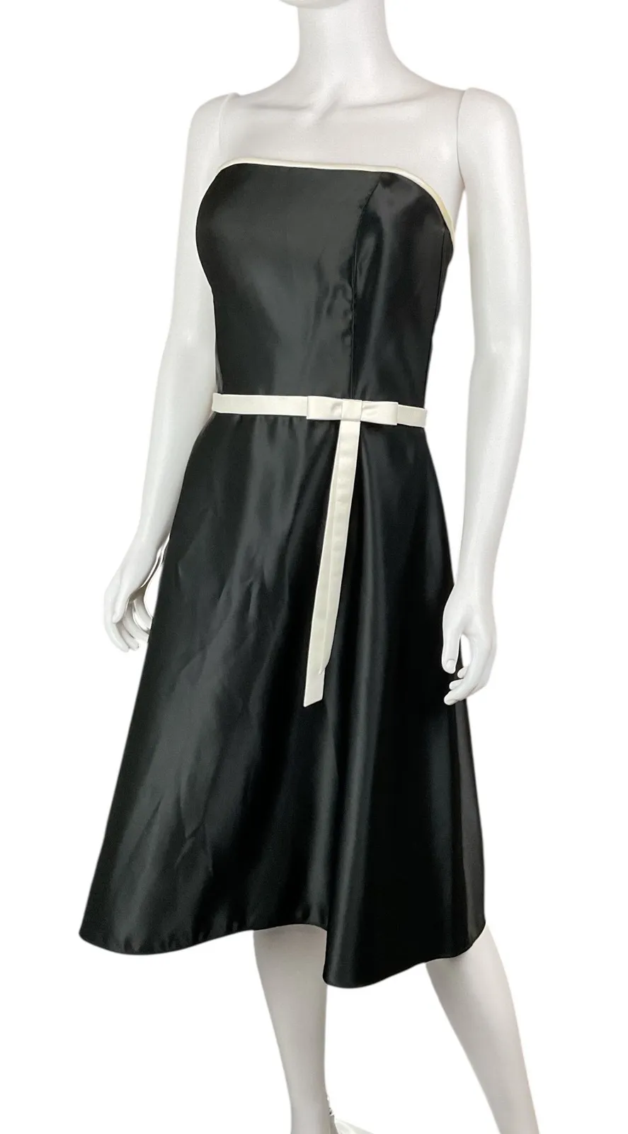 Elegant strapless dress suitable for formal and semi-formal occasions. This knee-length black dress features a flattering A-line silhouette, complemented by a cream-colored trim along the top edge and a matching self-tie belt that accentuates the waist. The dress has a classic strapless design, and the cream bow adds a touch of whimsy to the overall sophisticated look. Perfect for cocktail parties, evening events, or a special date night. Measurements: • Bust: 15 inches • Length: 37 inches Style: A-Line, Fit & Flare Dress Length: Knee Length Color: Black Department: Women Sleeve Length: Sleeveless Pattern: Solid Occasion: Party/Cocktail, Formal Material: Polyester Character: Classic, Elegant, Party Girl, Cocktail, Vintage Fabric Type: Satin Season: Spring, Summer, Fall Sleeve Type: Strapless Closure: Zip Keywords: Scott McClintock dress, black dress, strapless dress, cocktail dress, party dress, A-line dress, size 8 dress, knee length dress, formal dress, evening dress, black and cream dress, bow belt dress, vintage dress