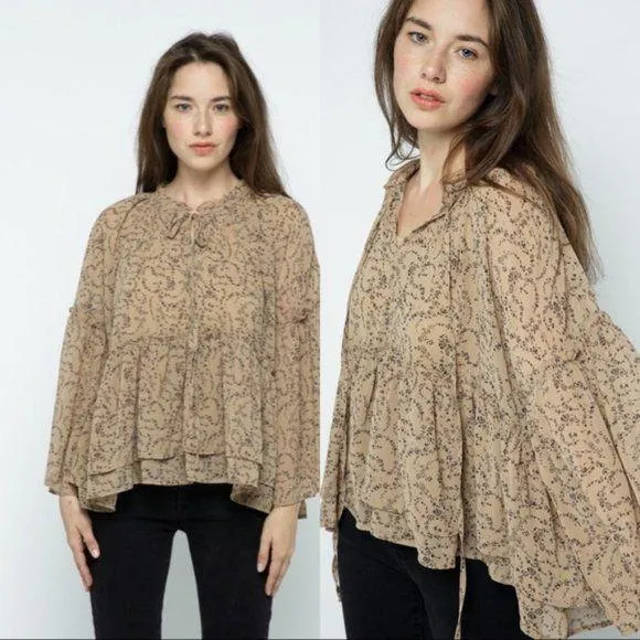 Our Scottsdale Flutter sleeve blouse features brown and black hues. This lightweight and relaxed blouse wears with a split neckline, tassel ties and long flutter sleeves. A dramatic touch with bohemian feels! Relaxed fit Split neckline Ruffle neckline Tassel ties Lined with cami Lightweight