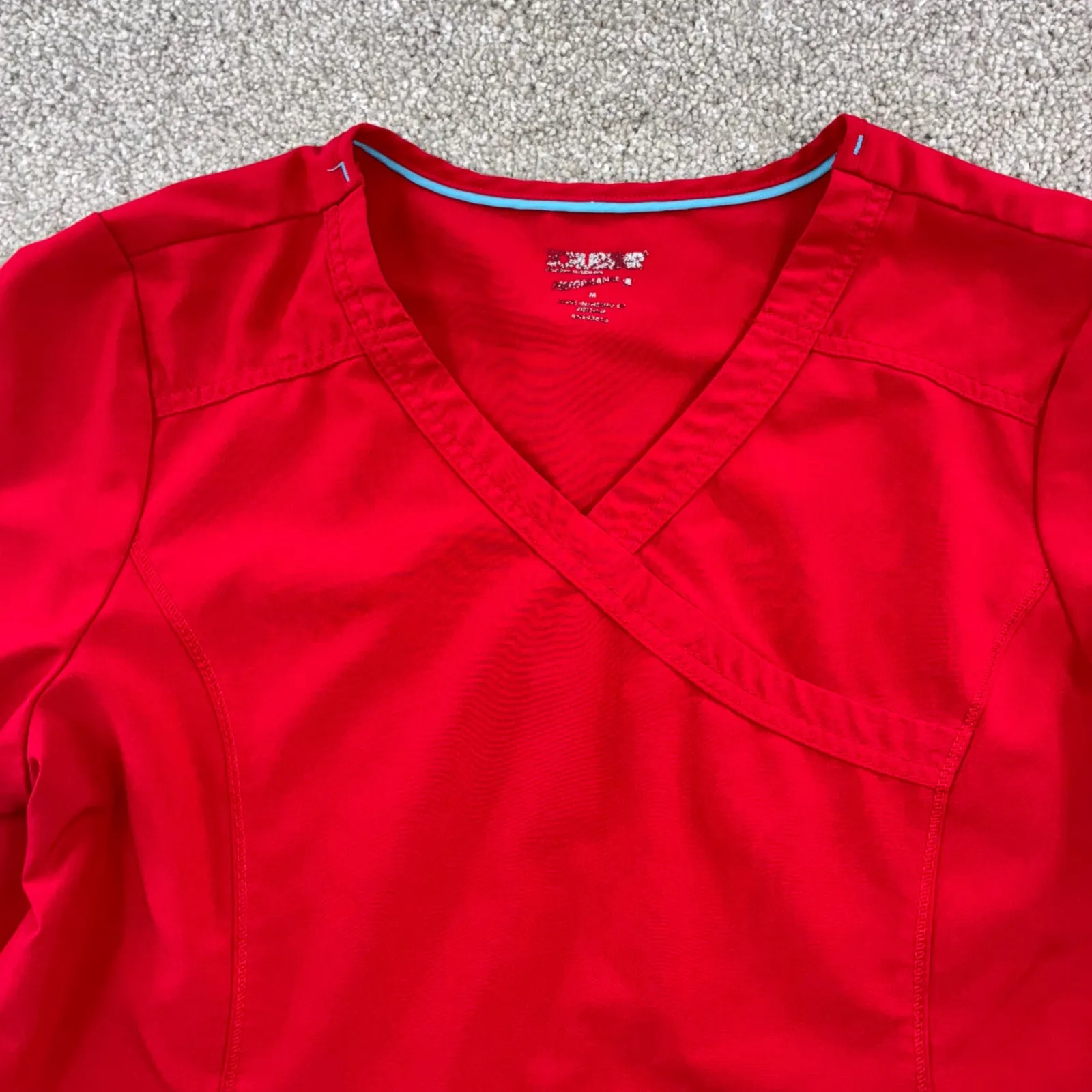 Measurements: • Length: 27 in • Sleeve Length: 22 in Type: T-Shirt Department: Women Style: Basic Material: Polyester, Spandex Neckline: V-Neck Sleeve Length: Short Sleeve Sleeve Type: Casual Sleeve Accents: Zipper Pattern: Solid Theme: Teacher Features: Pockets, Stretch, Wrinkle Resistant Fit: Regular Keywords: scrub top, medical uniform, nurse scrub, womens scrub top, mock wrap scrub, short sleeve scrub, red scrub top, hospital uniform, medical apparel, workwear, healthcare apparel, uniform top, size M, polyester scrub