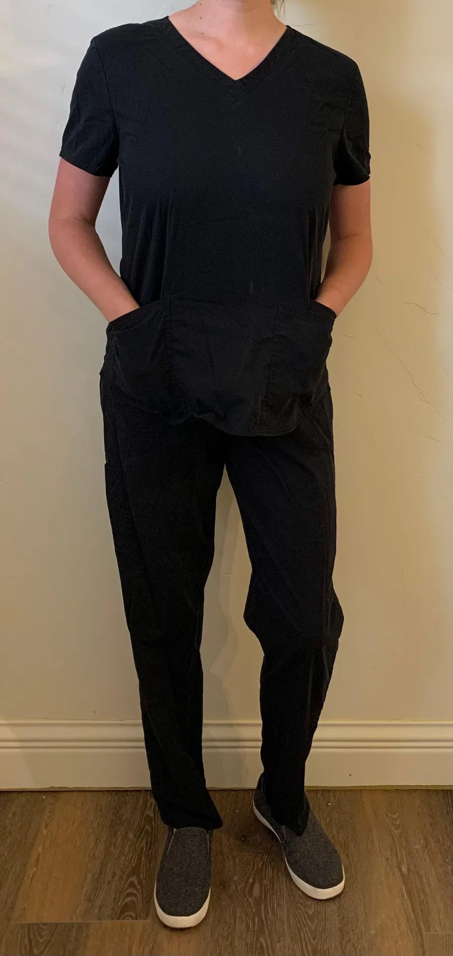 Black scrub top and bottom set in great condition. Loose fit and very comfortable cotton set. Top has two large pockets. Message me if you’d like to buy the top or bottom separately!
