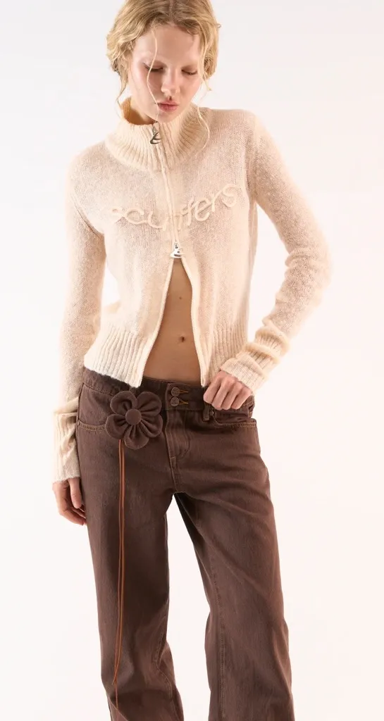 Brand: Scuffers Size: medium Color: ecru Sold out Ecru Zip Cardigan in soft brushed knit with a fitted silhouette. Features a ribbed high collar, two-way front zip with metal Scuffers pull tabs, and tonal embroidered logo across the chest. Finished with wide ribbed cuffs and hem.
