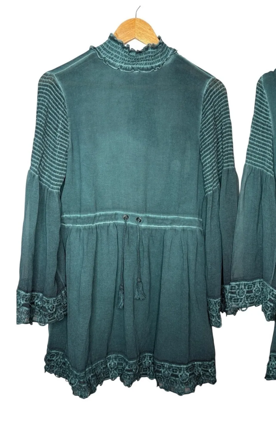 All orders shipped next business day. Sea Gypsies By Lost Hey Sunshine Dress Teal Green Boho Mock Neck Size Small NWT Sea Gypsies By Lost Hey Sunshine dress in a beautiful teal green. This charming piece features a smocked mock neckline, long bell sleeves with embroidered cuffs, and a cinched elastic waist with a tassel drawstring. The tiered skirt is finished with intricate embroidered trim. Lined. Condition: New with Tags Style: Sundress, Shift Dress Length: Short Department: Women Size: Small, Length- 33", Pit to Pit- 19.5" Material: Polyester Theme: Bohemian Neckline: High Neck Keywords: Sea Gypsies, boho dress, smocked, bell sleeves, embroidered, tassel, festival dress, hippie, resort wear, summer dress, teal, mini dress, cottagecore, ethereal, lace, Victorian inspired, open back