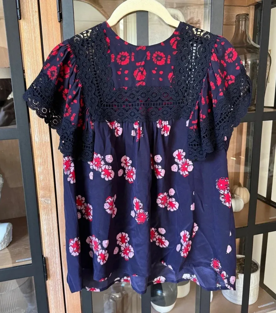 SEA New York Blouse Blue Silk Floral Print Lace eyelet ruffles Sleeve embroider Size XS - $50 - From Filo