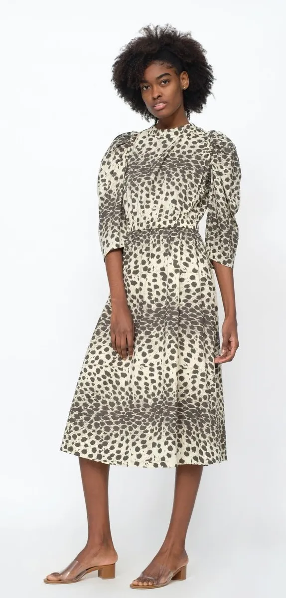 The Leo leopard midi dress features corded detailing, 3/4 puff sleeves, and button back detailing. Elasticized waist. Button back detailing. 100% cotton NATURAL Fit Tip Fits true to size. Fabric / Material 100% cotton