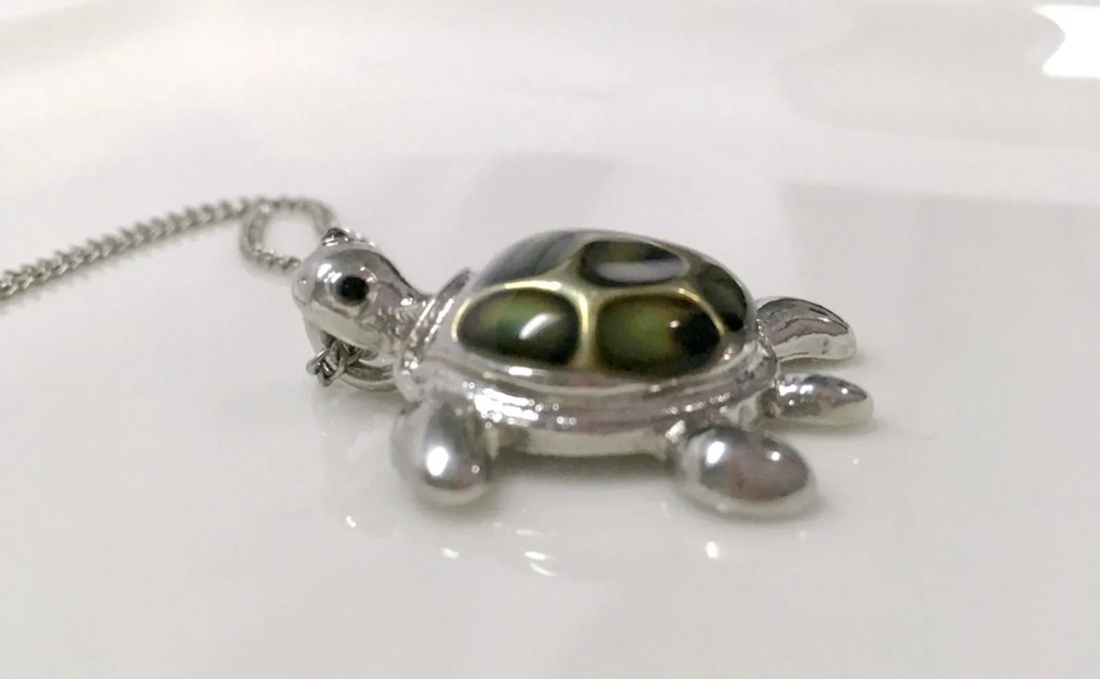 Cute sea turtle charm necklace in good preowned condition. The pendant is approximately 1 inch lon... Show more