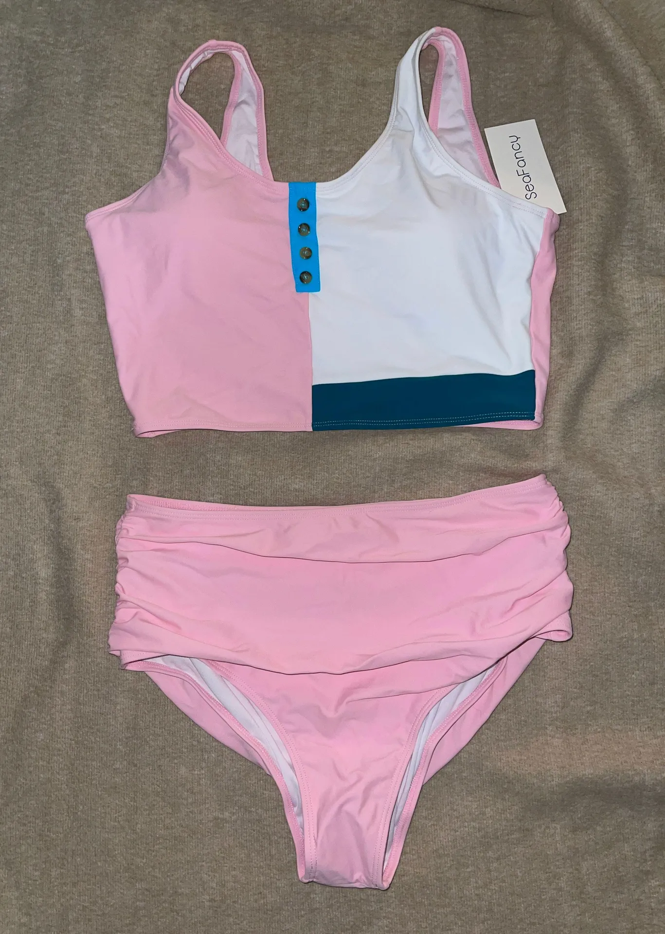 High waist swimsuit High neck Colorblock top Button detail Removable pads Fully lined New with tags and plastic lining on bottoms Ordered for a vacation but got lost in shipping so didn’t get it until after I got back Picture from website included