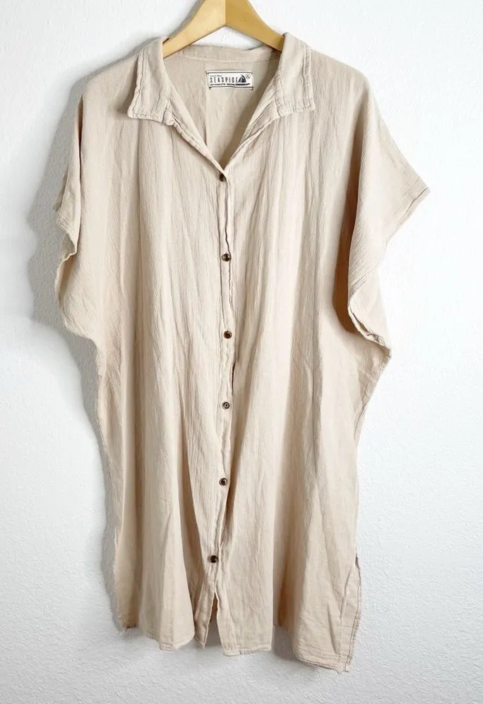 Seaspice Cover Up Neutral Button Front Peruvian Cotton Dress Size Extra Large Approximate measurements follow Chest- 27” Length- 36” Good preowned condition- a few small spots as shown