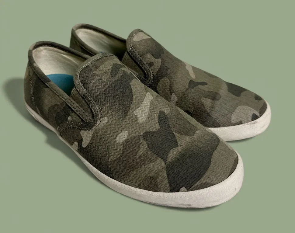 SeaVees Women's Baja Slip-On Sneakers - Camo Herringbone Twill Step out in casual, vintage-inspired style with these comfortable SeaVees Baja Slip-On sneakers. The perfect blend of California cool and everyday functionality. Key Features: • Style: Baja Slip-On—a timeless silhouette inspired by SeaVees' 1960s heritage. • Material: Durable Saltwash Herringbone Twill upper gives a unique, slightly distressed, vintage look. • Color/Pattern: Stylish Green Camouflage (Camo) pattern. • Comfort: Features a contoured, cushioned, and perforated footbed for breathability and lasting comfort (as noted on the brand's website). • Easy Wear: Twin elastic gore panels allow for easy on and off. Size: Women's US 7.5 / EU 38 / UK 5.5 Great Pre-Owned Condition- The saltwash herringbone twill upper is intact, and the camouflage pattern looks great. The interior lining and cushioned footbed show minimal wear. The white rubber sole/foxing shows signs of general wear and light dirt on the edges and bottom (as pictured), which is typical for canvas sneakers. The tread on the rubber sole is in excellent condition. Please review all photos for the best assessment of the condition.