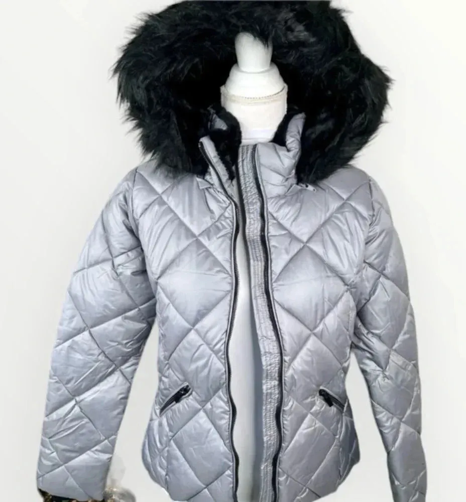 Condition: New with tags Flaws: None Size: Small Features: Quilted puffer coat with detachable hood. Color is Light Grey. Black faux fur trimmed hood. 2 side zipped pockets. Ribbed cuffs at sleeves. Material: polyester Machine washable: Yes Measurements approximate: laying flat and zipped Shoulder width 15.5” Sleeve length 25” Underarm to underarm 20” Total length from shoulder 23.5” ⭐️Ships Out Within 1 Business Day ⭐️Smoke Free Environment