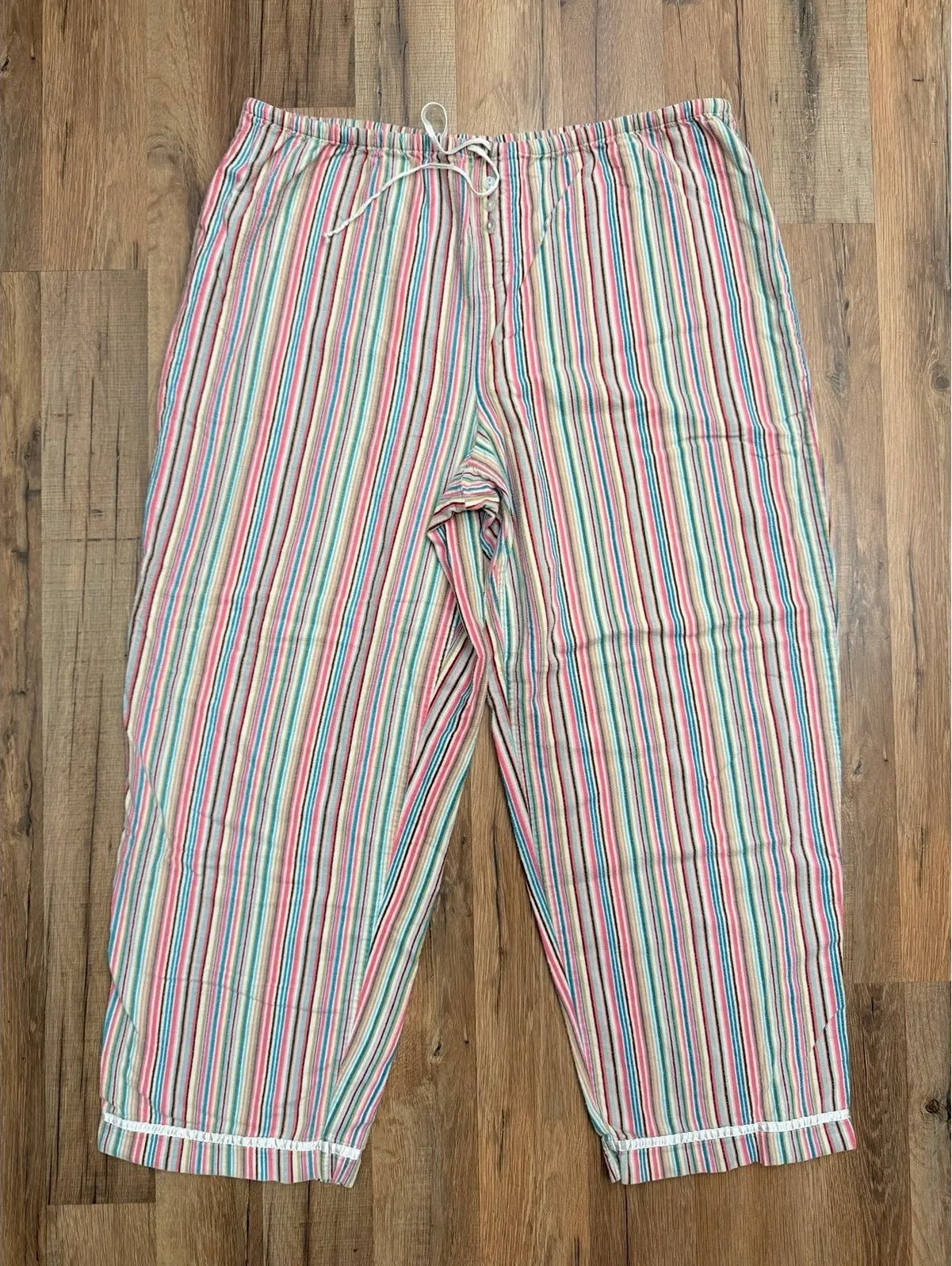 Cozy Secret Treasures women's pajama pants in size Large (12/14). Made of 100% breathable cotton, featuring a colorful multi-stripe pattern. Elastic waistband with functional drawstring and side pockets. Perfect for lounging or sleepwear. Measurements (approx.): • Waist: 16" flat (elastic & adjustable tie) • Rise: 12" • Inseam: 26" • Length: 37" Condition: Gently pre-owned, clean, no flaws noted. Smoke-free home. ⸻ #SecretTreasures #PajamaPants #CottonSleepwear #CozyLounge #StripedPants G/2